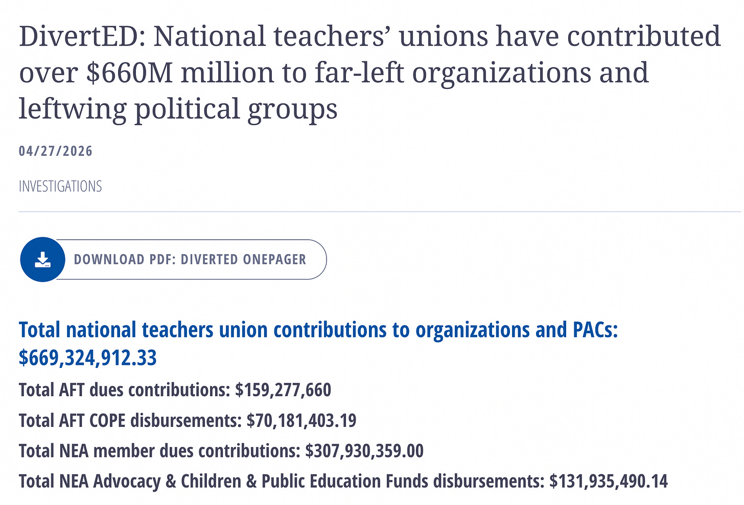 The NEA and AFT were already billion-dollar organizations with thousands of staff and a significant political footprint. Contemporary analysis showed millions flowing into campaigns, lobbying, and political operations well beyond collective bargaining but only a handful of journalists wrote of his work.